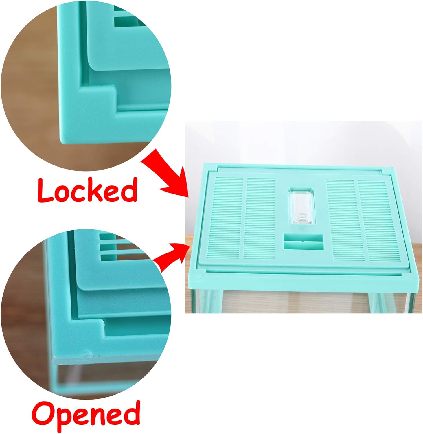 - Glass tank and pale Green cover. Top window ventilation,safe lock prevent escape, a feeding hole