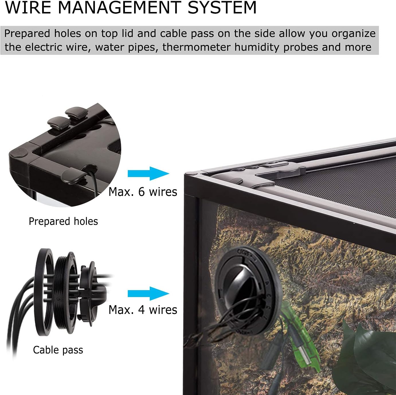 - ăGreat Wire OrganizationăPre-designed 6 closable inlets for wires and tubing and an extra cable pass allow 4 wires pass through, a perfect way to organize your power wire, hygrometer wire, thermometer wire and other cables easily and neatly.