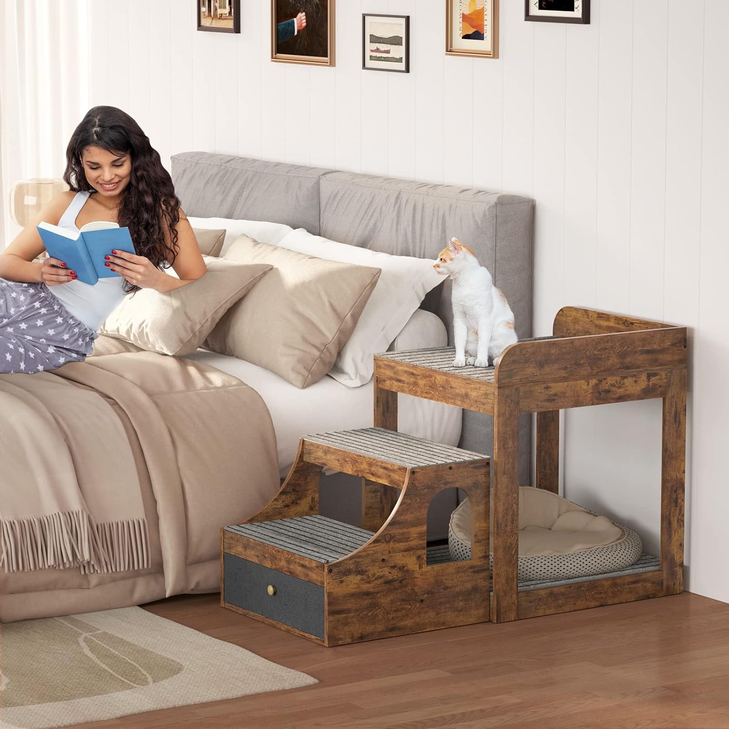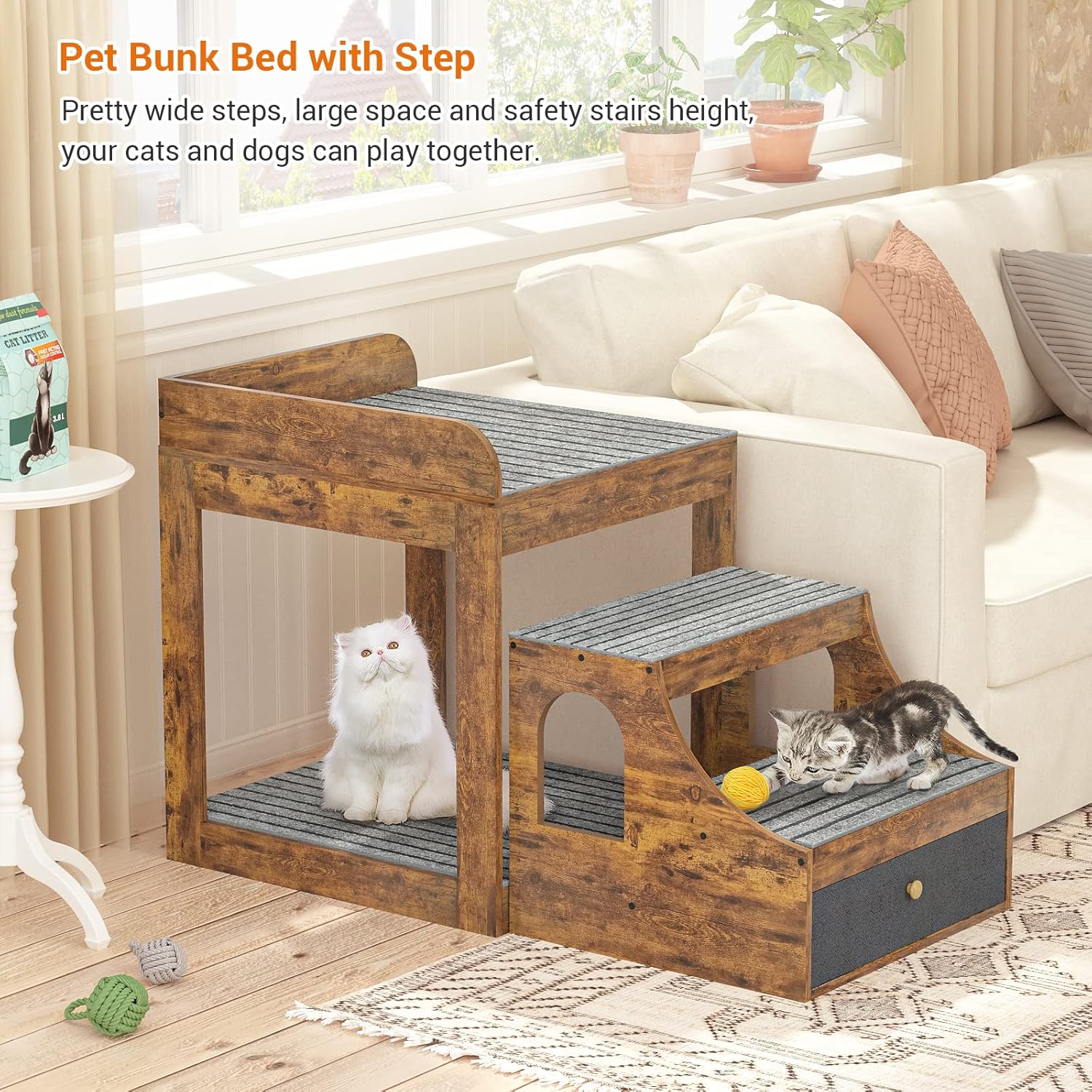 - š¾ Large Space with a Storage Drawer - The space underneath the bed is large too, so your dogs and cats can play together. The top bed space is 21.65*21.65 inches, providing a safe and large space to lie down and rest. It can hold up to 250 lbs. The drawer underneath the stair is large too, you can install your pet's toys and food too.