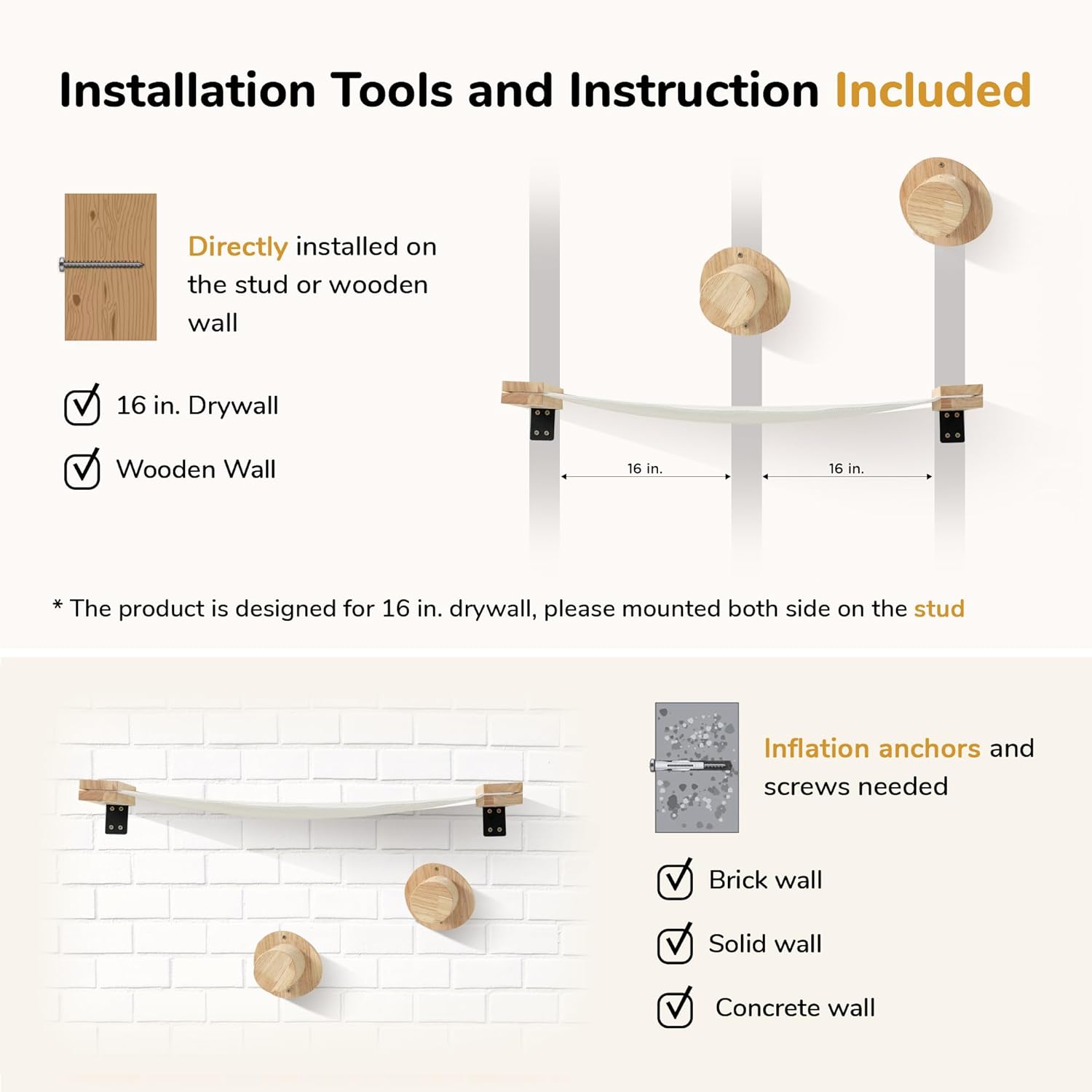 - Premium Design - For most family, drywall is supported behind by 16 in spacing wood stud, the cat perch and wall ladders are designed to ensure at least one side can be installed on the stud, maximum stability.