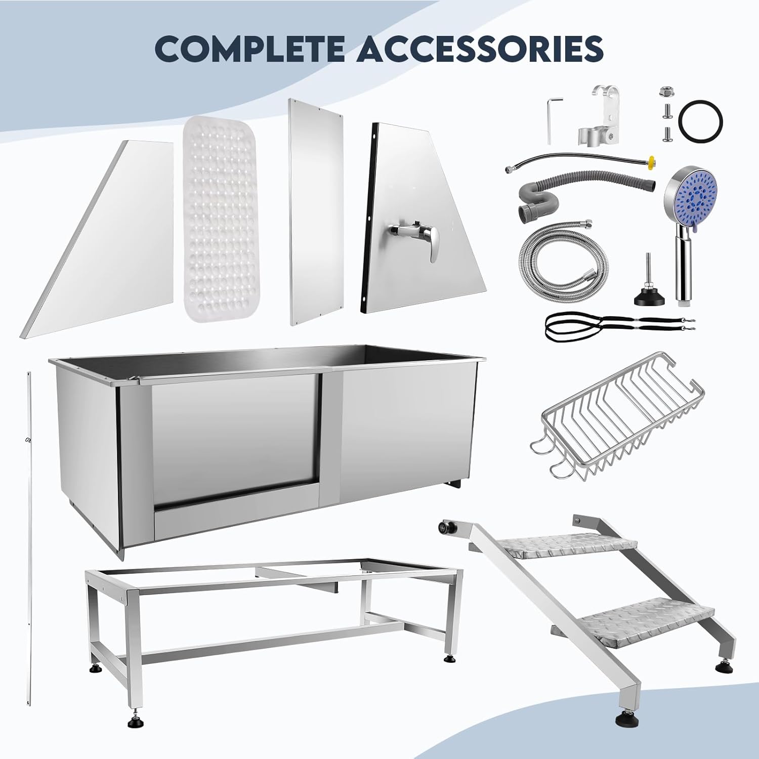 - ❄️Easy to assemble:The grooming bath tub comes with all needed parts.Package Content:1 x Tub Faucet,1 x Sprayer with Hose,1 x Drain kit,1 x Hair trap,1 x Hot and Cold Water Hoses,1 x S-shaped Drainage Pipe,1 x Stainless Steel Shampoo Rack,1 x Fixing Rope.And some screws which.