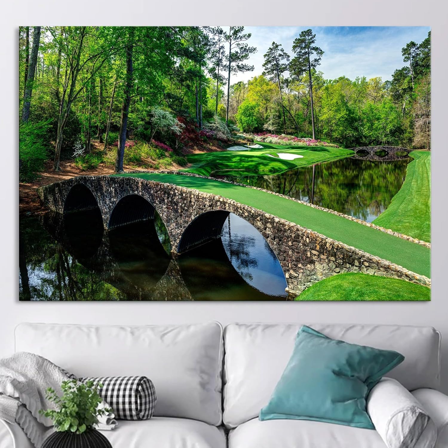 Nature Wall Art Prints - Ocean Forest Mountain Lake Canvas Landscapes - Small to Extra Large Living Room Bedroom Kitchen Bathroom Décor (Golf Course with Stone Bridge, 28L" x 41W")