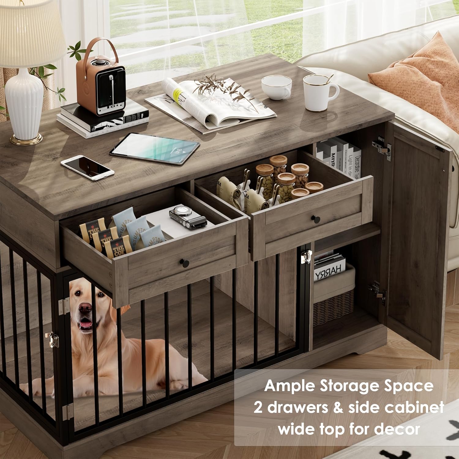 - Dog cage sideboard with storage: 47”X24” massive table top allows to place some decorations. 2 drawers and a spacious cabinet with shelf provide extra storage space for pet items such as dog toys, snacks, food etc. This dog kennel sideboard with drawers is functioning furniture for owners of small and medium-sized dogs, who apart from the comfort of pets, also care about the interior design.