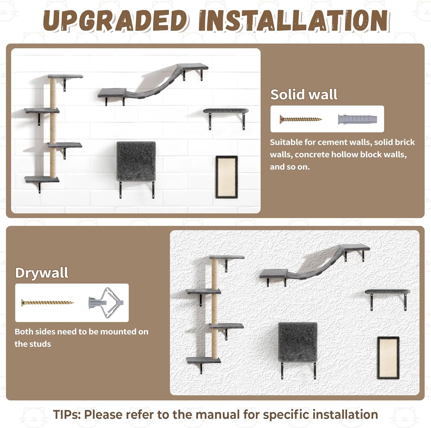- Safe & Heavy-Duty Construction: Every cat wall-mounted tree component supports up to 22 lbs, reinforced with triangular metal brackets. Smooth, burr-free edges and optional cat shelves with carpet grey ensure safety for playful cat climbers of all breeds.