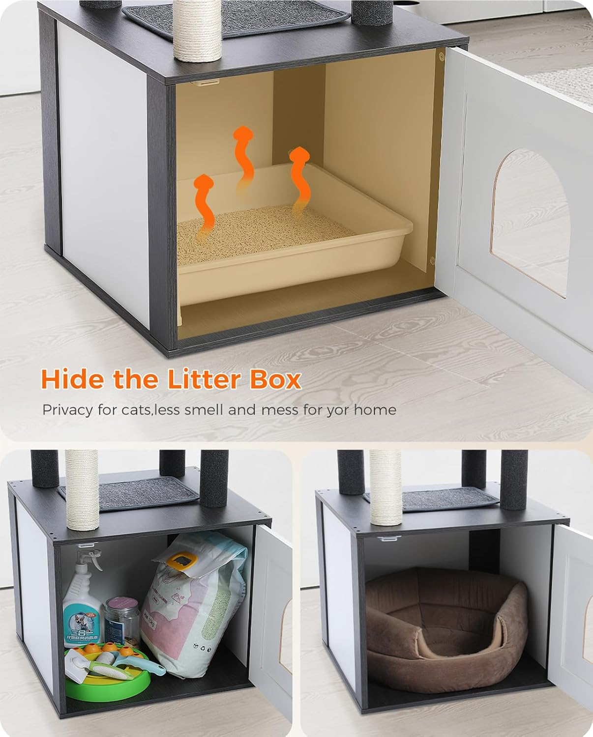 - Space-Saving Litter Box Enclosure Cabinet: Combines functionality with style; innovative design for a discreet litter box solution.