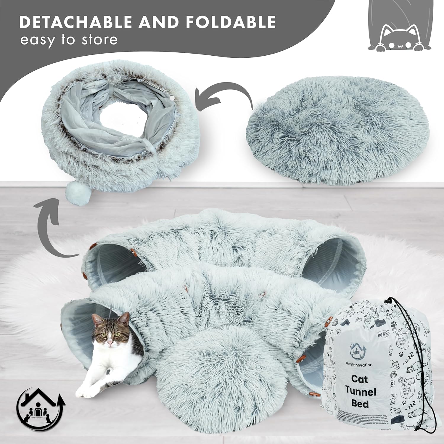 - 𝗖𝗼𝗹𝗹𝗮𝗽𝘀𝗶𝗯𝗹𝗲 𝗮𝗻𝗱 𝗖𝗼𝘇𝘆: Warm and fluffy design that can be turned to donut, moon shaped or a long tunnel with fluffy balls. Washable and easy to clean.