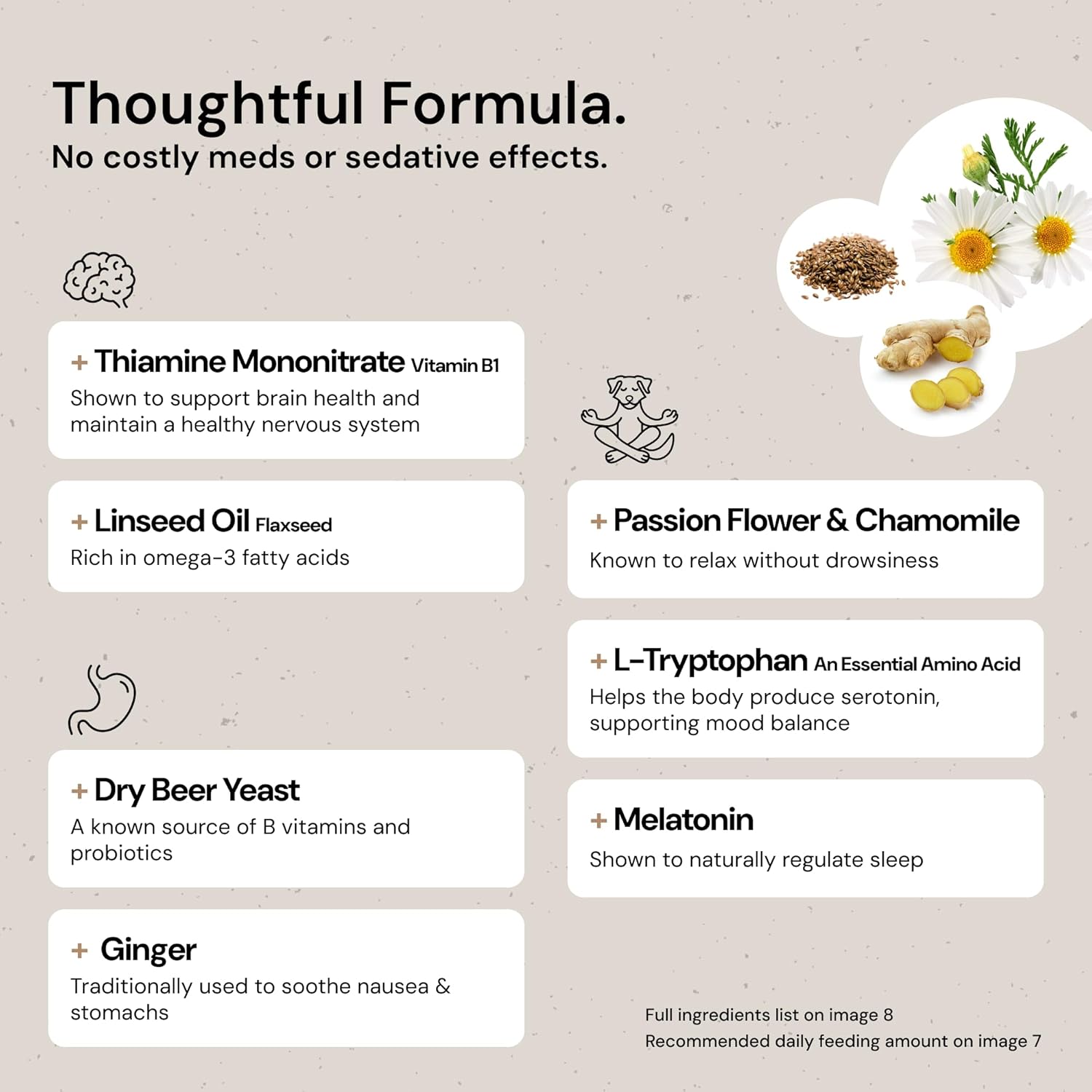 - Thoughtful Formula: With Passion Flower & Chamomile known for relaxation, Vitamin B1 for irritability, Amino Acids for mood, & Melatonin for dogs known for sleep, our dog calming treats are made with ingredients shown to bring comfort without sedation