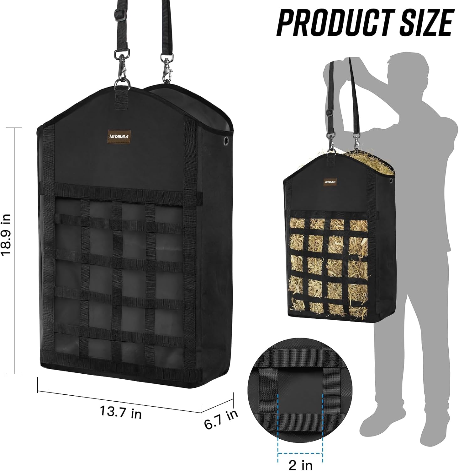 - Premium Material:The hay bags for horses is crafted from premium 600D oxford cloth, ensuring exceptional strength and durability. The tight stitching enhances its resistance to wear and tear, making it highly resistant to being torn or bitten by pets. Rest assured, this hay bag is built to last, providing you with a long service life.