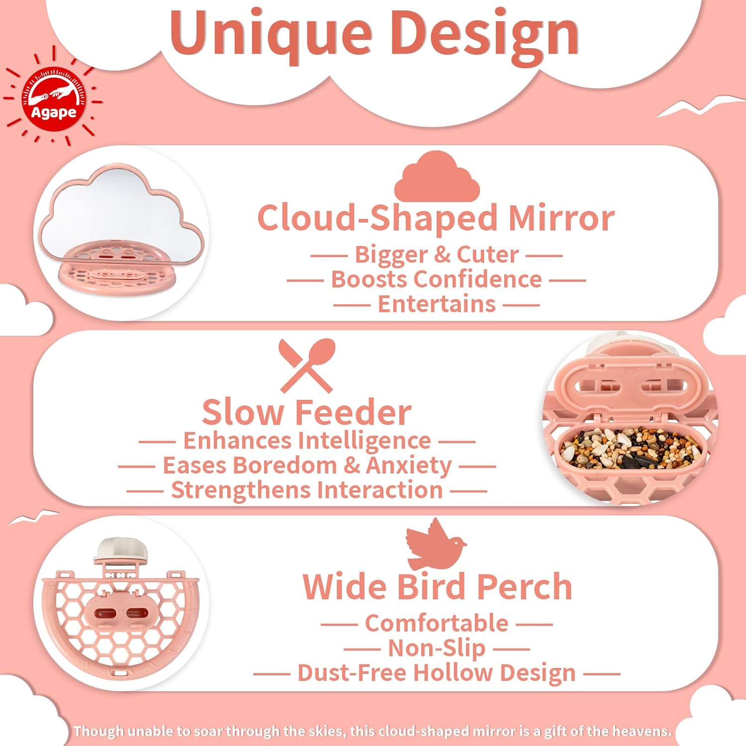- 【Concept】Inspired by the soft, flowing shapes of clouds in the sky, our product symbolizes the freedom we wish for birds to have. While our birds may not soar high above, we can still gift them a special treasure from the heavens. If you have any questions or need assistance, Agape is here for you 24/7, ready to provide support whenever you need it
