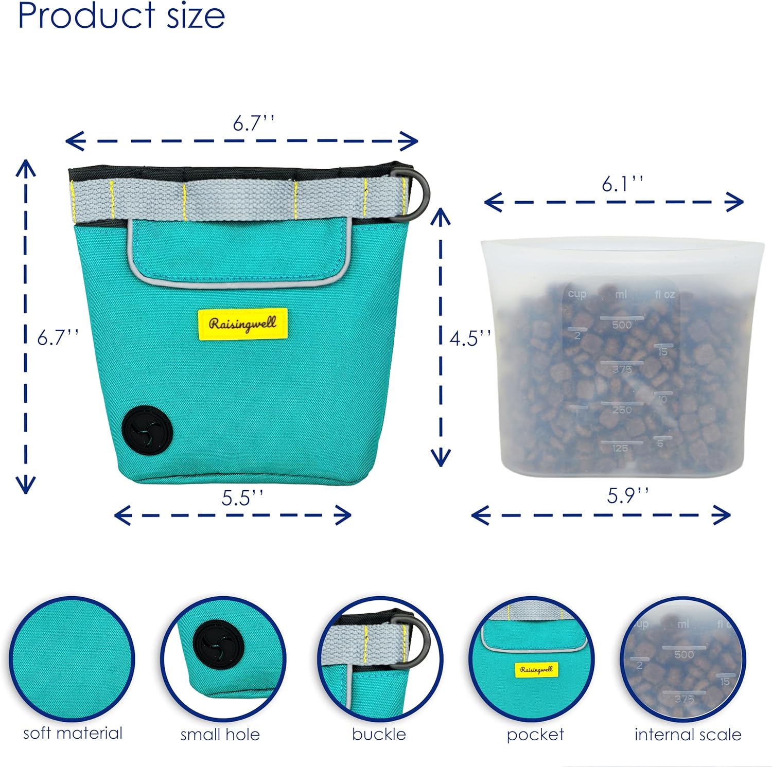 - 5.Durable Tech Material: Raisingwell's dog treat training pouch is made from durable, washable, and non-toxic fabric. Notably, its waterproof lining solves the problem of difficult-to-clean interiors of training bags, making it a great choice for your dog treat bag or dog treat fanny pack.