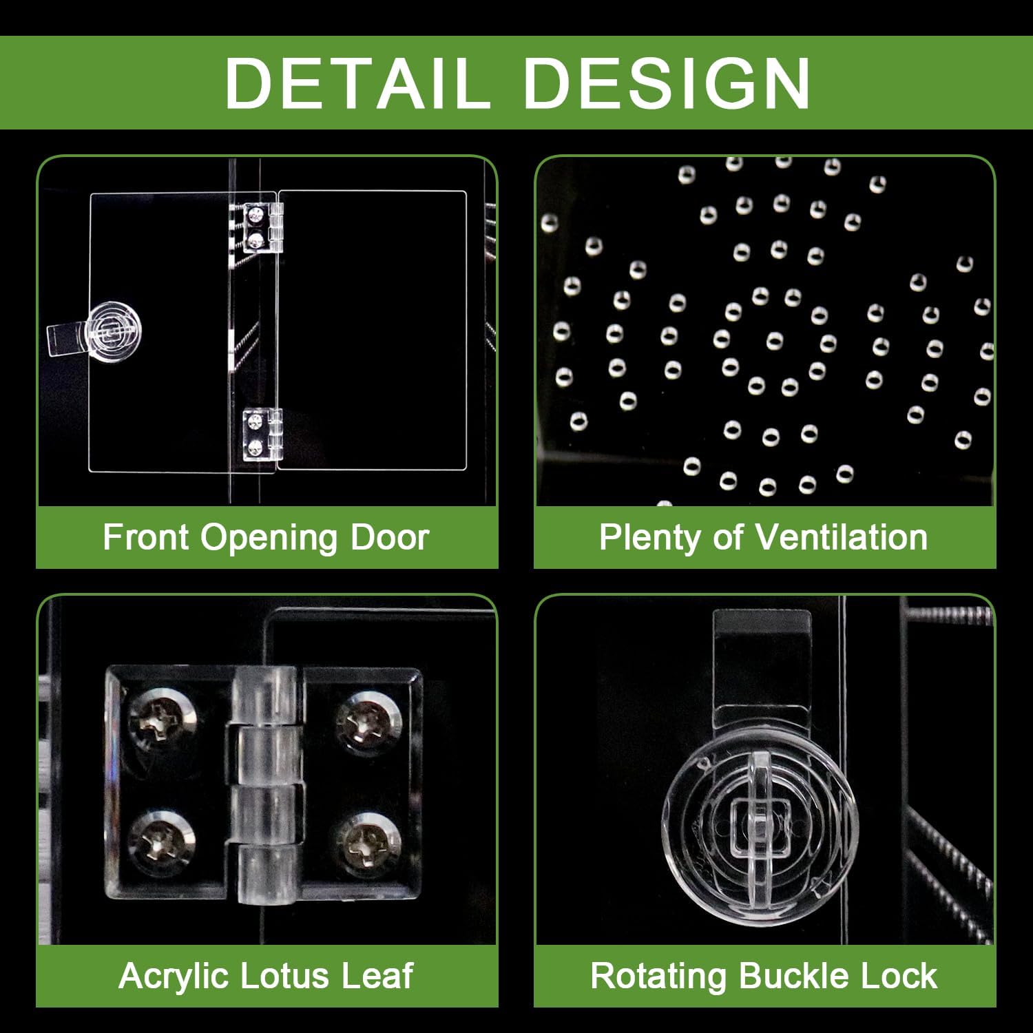 - 【Front Opening Jumping Spider Enclosure】Square design with front opening door, not only more convenient for you to place habitat decor and substrate inside, but also more convenient for feeding and cleaning