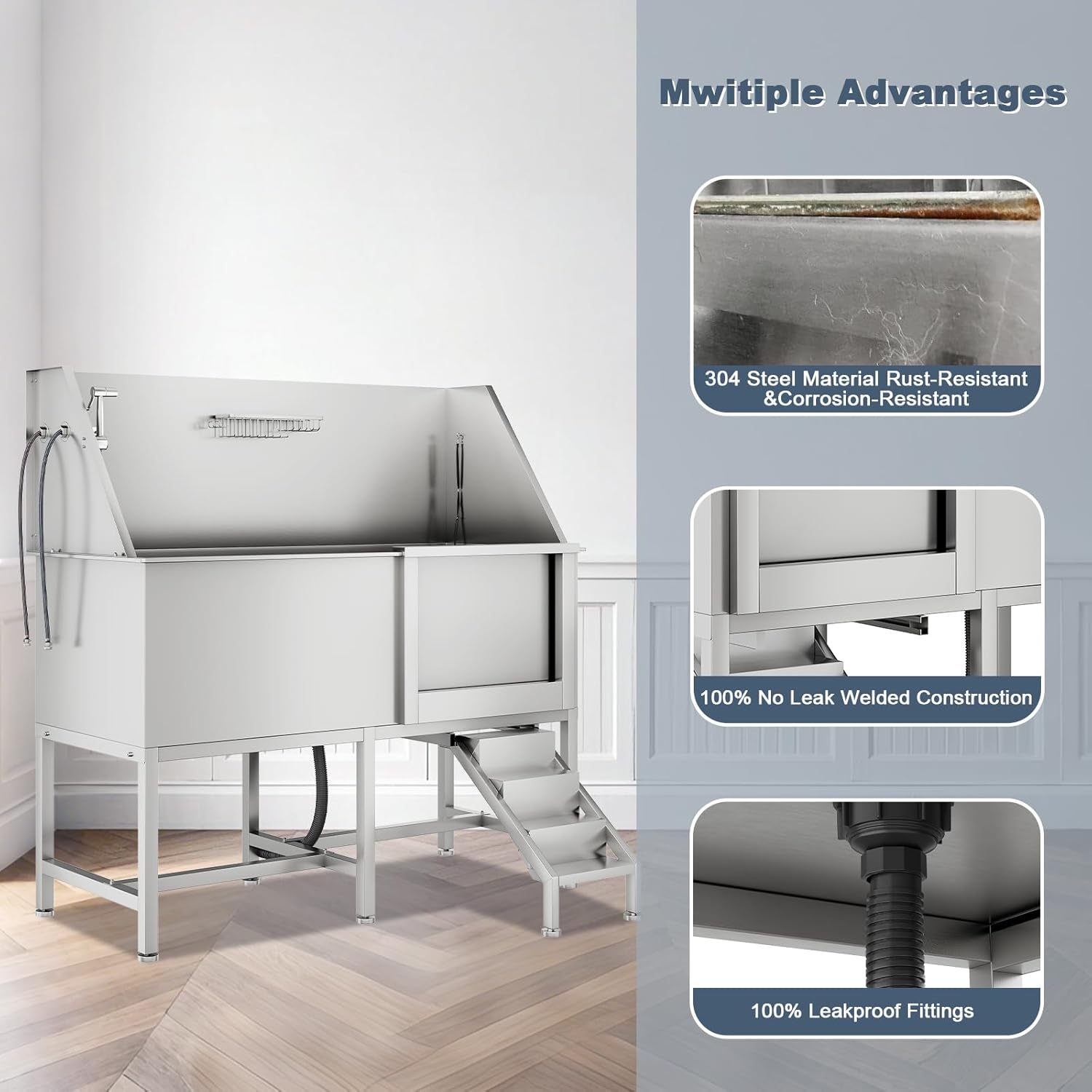 - DOUBLE-AGAINST WATER ACCUMULATION:The stainless steel dog washing station features seamless welding, ensure that the tub bottom and water pipe interface for a leak-free experience. High back and side panels and a sealed door keep splashes contained, while the anti-slip floor grate and sink drain strainer collects hair to prevent clogs. The 1.77" drainage hose allows for quick water removal.