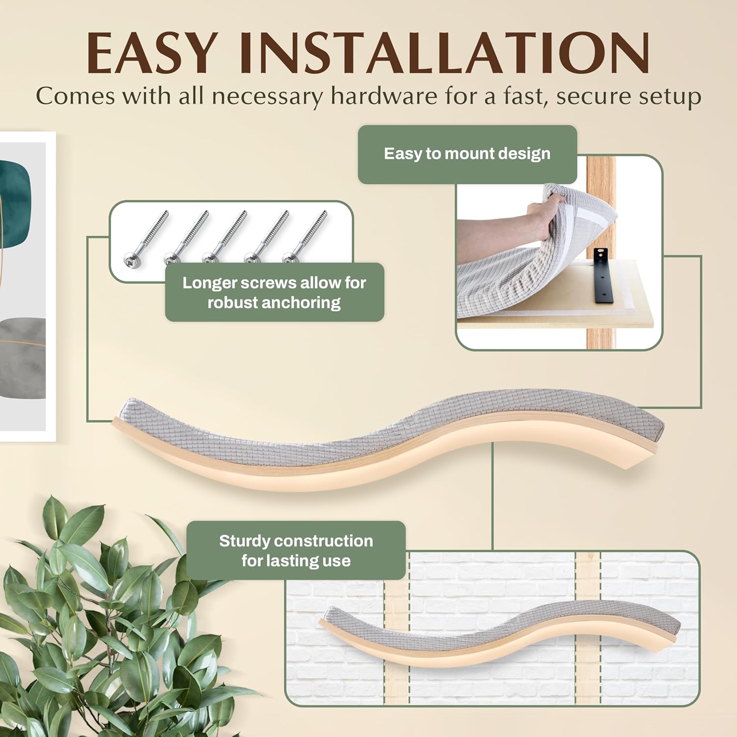 Extra Large 35.4” × 11.6” Stylish Cat Wall Shelves with Soft Cushion, Modern Wall-Mounted Cat Tree Furniture & Perch, Sturdy/Hidden Mounts, Machine Wash Cover, Sleek Design- CALLICO HAVEN Wave S-Shape