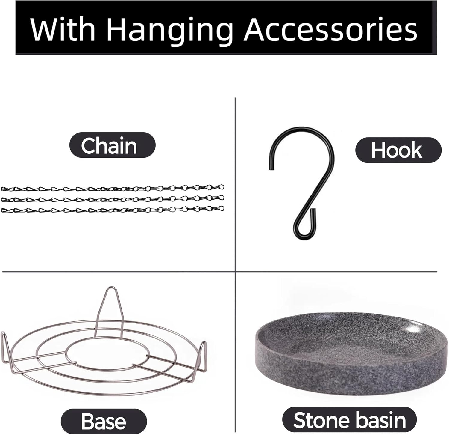 - Comes with 3 essential components : stone bird baths 10"L*10"W *1.6"D, Hanging Chain 15.7 inches, and a metal base for stability. Everything you need to set up a charming bird bath in your garden right away.