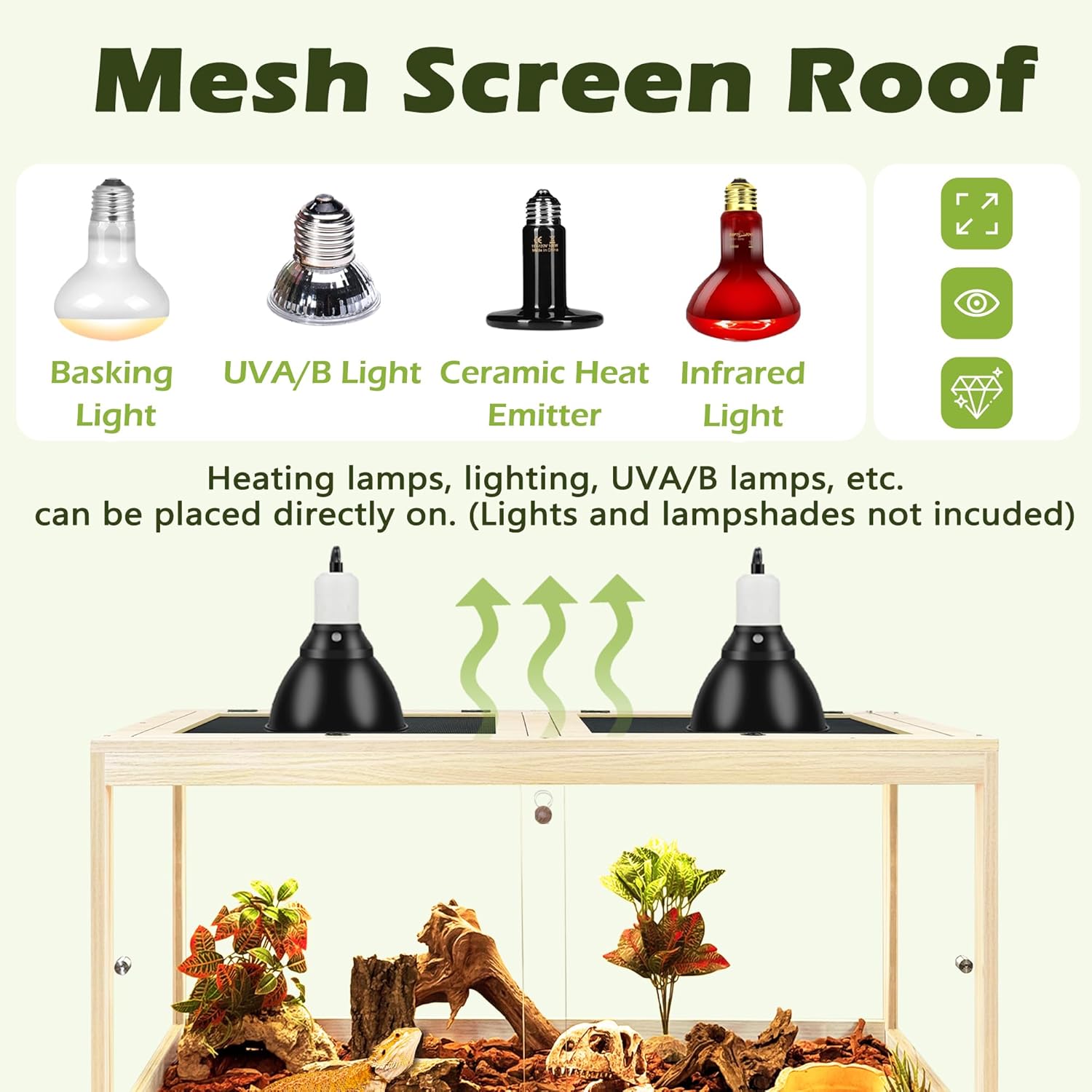- 【Smart Design for Comfort & Security】The front features double sliding glass doors with a secure lock for easy access and peace of mind. A sturdy metal mesh top ensures proper ventilation and is compatible with heat lamps or UVA/UVB lighting setups (not included), helping maintain the perfect conditions for your reptiles.