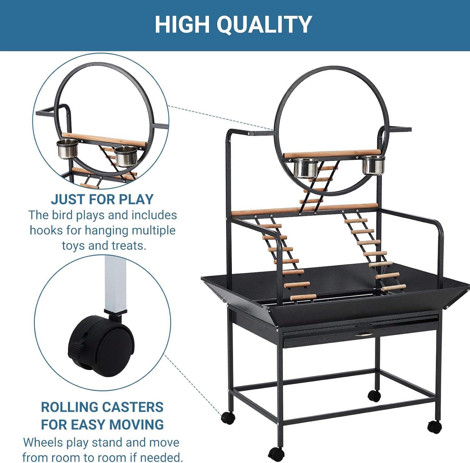 Bird Playstand, 66'' H Inch Birdcage Stand Activity Play Center with Perches and Ladders, Removable Tray, Indoor Outdoor Playground for Parakeet,Cockatiels Conures Parrots, Lockable Caster,Black