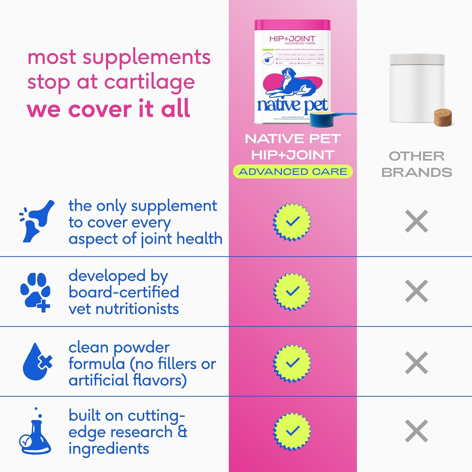- COMPLETE JOINT HEALTH SUPPORT – A unique dog hip and joint supplement that targets every aspect of mobility and outperforms glucosamine for dogs in supporting joint function, connective tissue integrity, muscle strength, and a healthy inflammatory response.